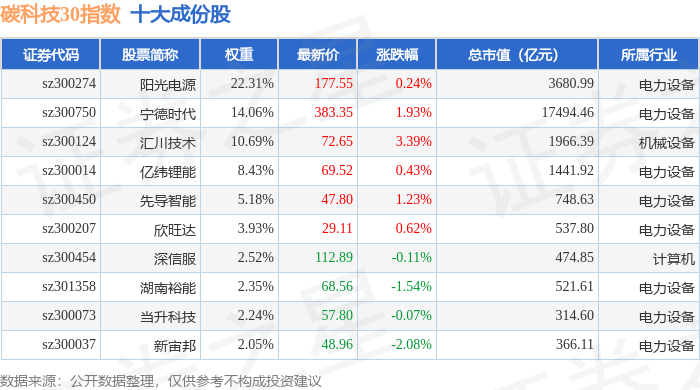 证券之星消息,12月4日,碳科技30(399030)指数报收于4478.78点,涨0.66%,成交342.53亿元,换手率1.89%。当日该指数成份股中,上涨的有16家,汇川技术以3.39%的涨幅领涨,下跌的有14家,蓝晓科技以2.31%的跌幅领跌。