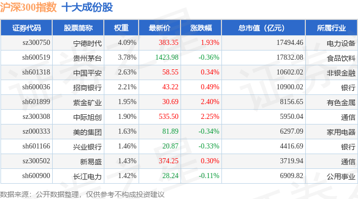 沪深300(399300)指数十大成份股详情如下: