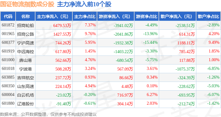 资金流向方面,国证物流(399353)指数成份股当日主力资金净流出合计5.16亿元,游资资金净流出合计988.14万元,散户资金净流入合计5.26亿元。成份股资金流向详情见下表: