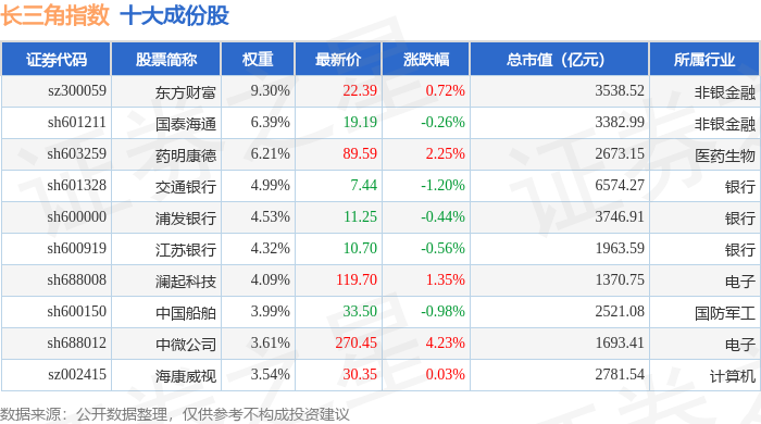 长三角(399355)指数十大成份股详情如下: