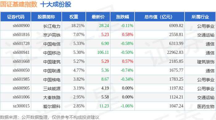 证券之星消息,12月4日,国证基建(399359)指数报收于2693.23点,跌0.13%,成交162.45亿元,换手率0.34%。当日该指数成份股中,上涨的有13家,中国核建以5.37%的涨幅领涨,下跌的有32家,新奥股份以1.45%的跌幅领跌。