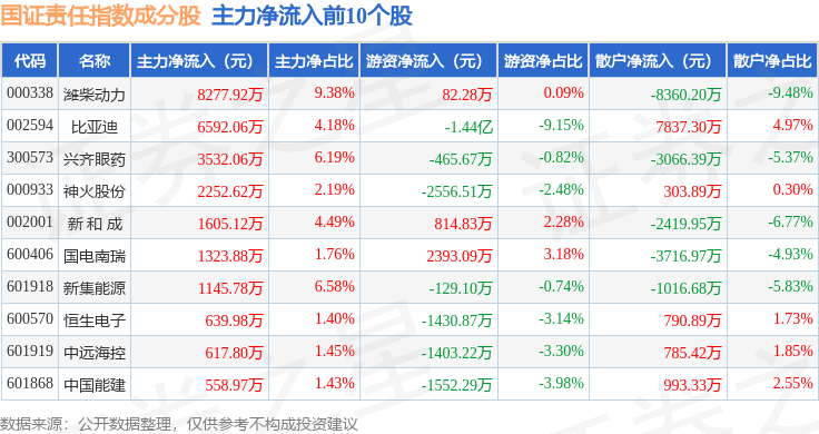 资金流向方面,国证责任(399369)指数成份股当日主力资金净流出合计33.94亿元,游资资金净流入合计7.04亿元,散户资金净流入合计26.42亿元。成份股资金流向详情见下表: