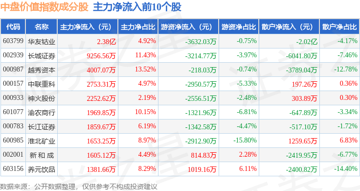 资金流向方面,中盘价值(399375)指数成份股当日主力资金净流出合计13.63亿元,游资资金净流入合计9292.54万元,散户资金净流入合计12.7亿元。成份股资金流向详情见下表: