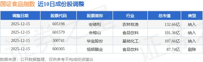 近10日内国证食品(399396)指数成份股做了调整,新纳入了3只股票,剔除了1只股票。