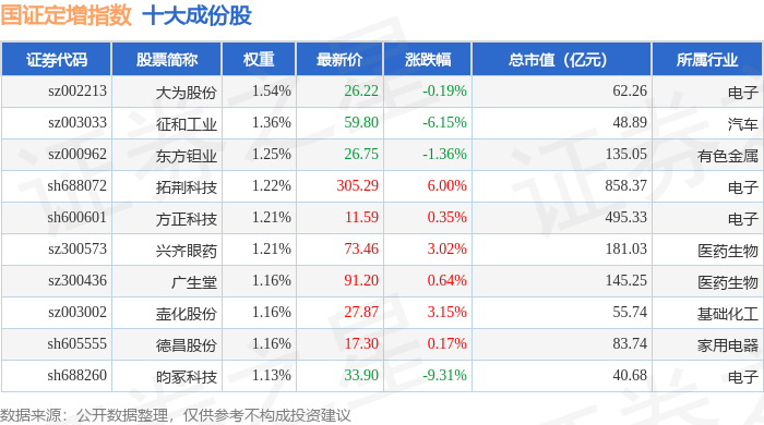 国证定增(399428)指数十大成份股详情如下: