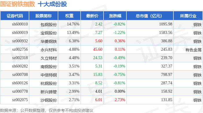 国证钢铁(399440)指数十大成份股详情如下: