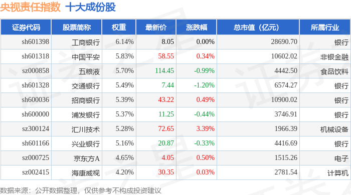 央视责任(399555)指数十大成份股详情如下: