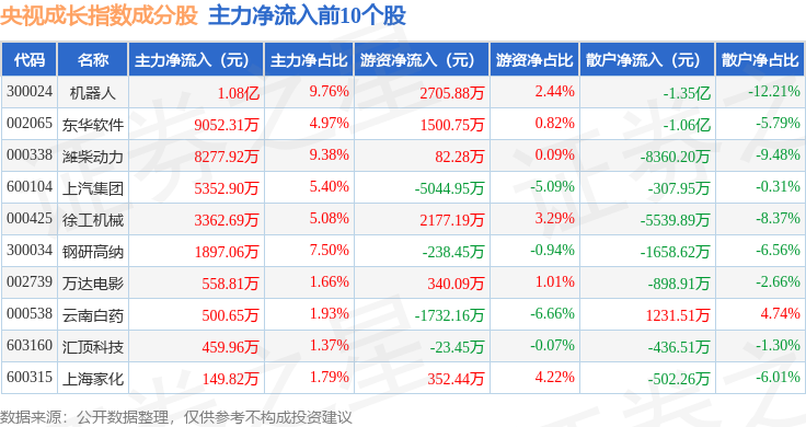 资金流向方面,央视成长(399552)指数成份股当日主力资金净流出合计18.3亿元,游资资金净流入合计4.89亿元,散户资金净流入合计13.4亿元。成份股资金流向详情见下表: