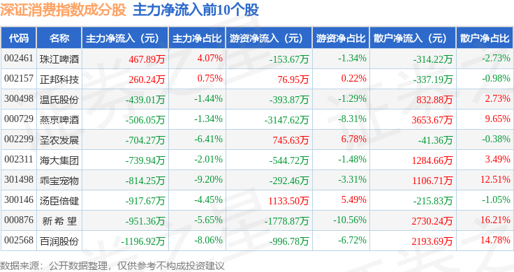 资金流向方面,深证消费(399617)指数成份股当日主力资金净流出合计12.5亿元,游资资金净流入合计2.36亿元,散户资金净流入合计10.13亿元。成份股资金流向详情见下表: