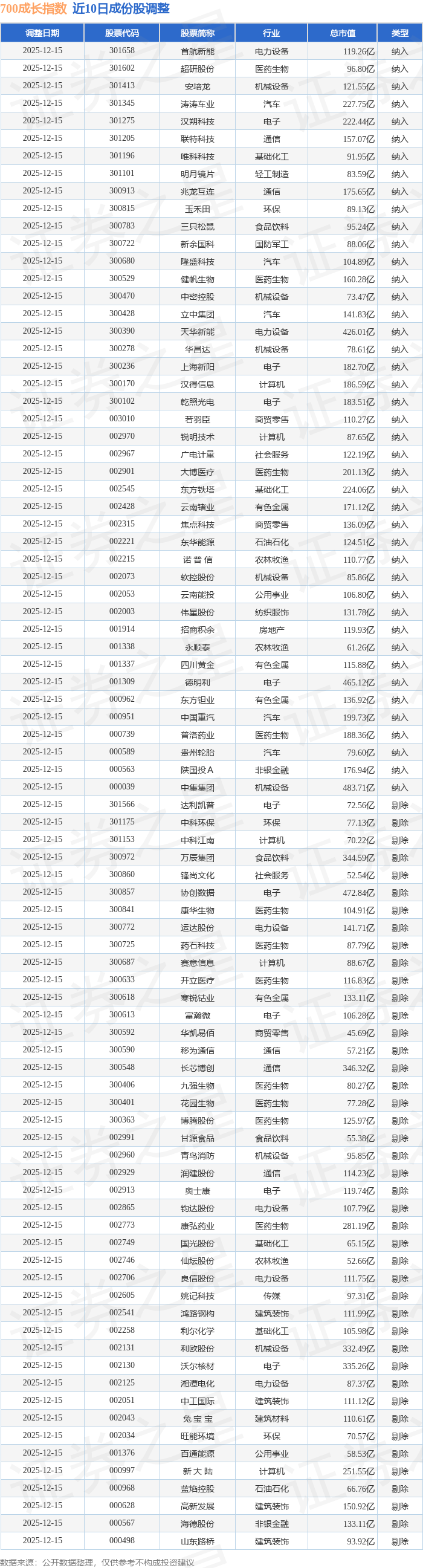 近10日内700成长(399628)指数成份股做了调整,新纳入了43只股票,剔除了43只股票。