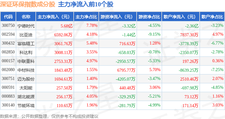 资金流向方面,深证环保(399638)指数成份股当日主力资金净流出合计14.79亿元,游资资金净流出合计5.45亿元,散户资金净流入合计20.24亿元。成份股资金流向详情见下表: