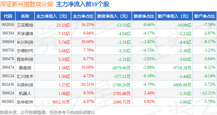 资金流向方面,深证新兴(399641)指数成份股当日主力资金净流出合计27.28亿元,游资资金净流出合计24.79亿元,散户资金净流入合计52.07亿元。成份股资金流向详情见下表: