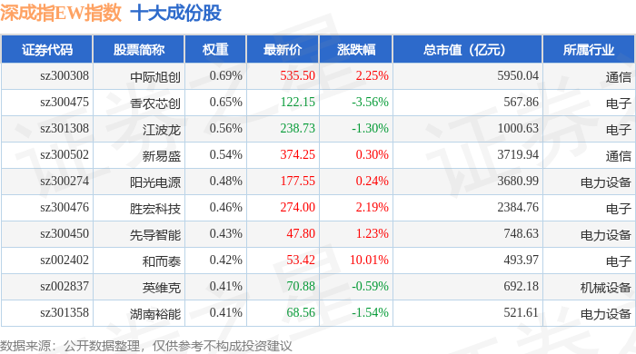 证券之星消息,12月4日,深成指EW(399659)指数报收于4496.15点,跌0.04%,成交3896.3亿元,换手率1.41%。当日该指数成份股中,上涨的有204家,盈趣科技以10.02%的涨幅领涨,下跌的有283家,广和通以6.51%的跌幅领跌。