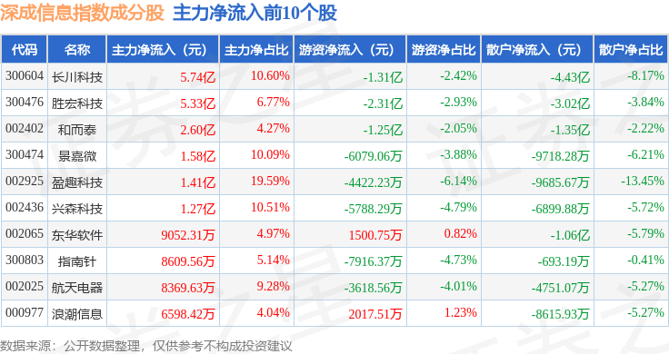 资金流向方面,深成信息(399687)指数成份股当日主力资金净流出合计25.85亿元,游资资金净流出合计5.64亿元,散户资金净流入合计31.49亿元。成份股资金流向详情见下表: