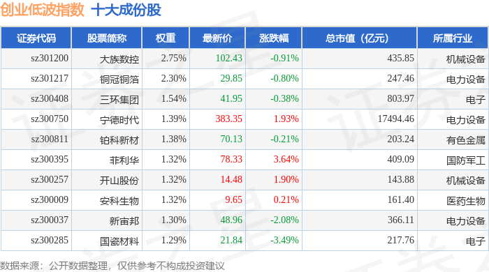 证券之星消息,12月4日,创业低波(399692)指数报收于3760.93点,跌0.56%,成交340.12亿元,换手率1.26%。当日该指数成份股中,上涨的有33家,菲利华以3.64%的涨幅领涨,下跌的有66家,海看股份以6.77%的跌幅领跌。