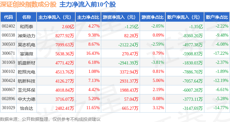 资金流向方面,深证创投(399696)指数成份股当日主力资金净流出合计34.97亿元,游资资金净流入合计4.07亿元,散户资金净流入合计30.9亿元。成份股资金流向详情见下表: