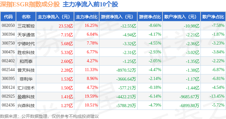 资金流向方面,深指ESGR(470026)指数成份股当日主力资金净流出合计55.49亿元,游资资金净流出合计21.24亿元,散户资金净流入合计76.73亿元。成份股资金流向详情见下表: