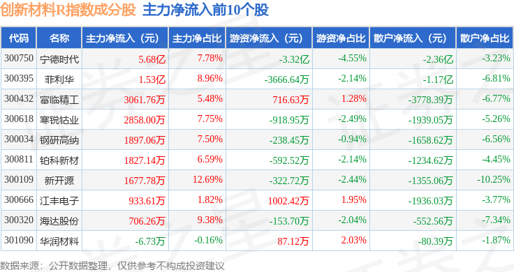 资金流向方面,创新材料R(470039)指数成份股当日主力资金净流出合计10.04亿元,游资资金净流出合计2.76亿元,散户资金净流入合计12.81亿元。成份股资金流向详情见下表: