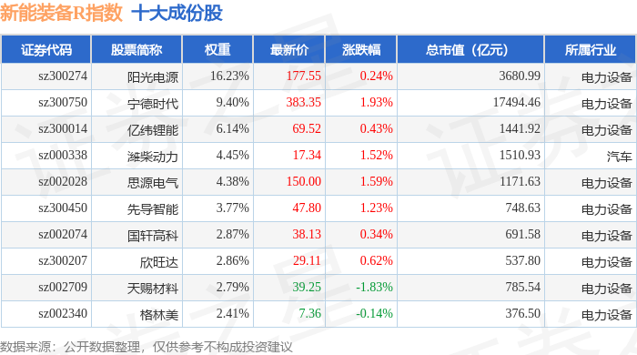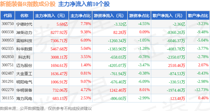 资金流向方面,新能装备R(470043)指数成份股当日主力资金净流出合计16.08亿元,游资资金净流出合计6.23亿元,散户资金净流入合计22.31亿元。成份股资金流向详情见下表: