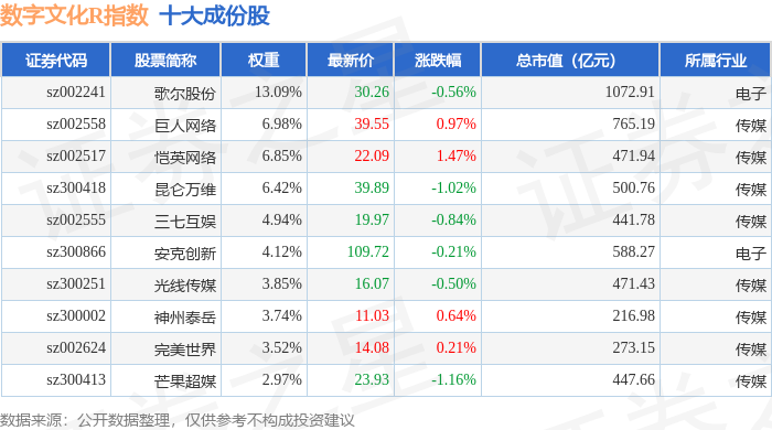 证券之星消息,12月4日,数字文化R(470047)指数报收于1141.73点,跌0.31%,成交191.25亿元,换手率2.83%。当日该指数成份股中,上涨的有14家,盈趣科技以10.02%的涨幅领涨,下跌的有36家,惠威科技以7.49%的跌幅领跌。