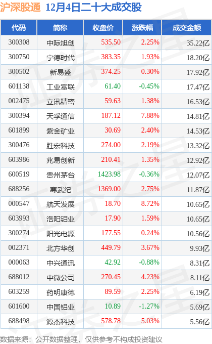 当日北向资金余额额度充足,龙溪股份(600592)领涨,涨幅10.0%,交易所公布的沪深股通二十大成交股中成交额前三的为中际旭创、宁德时代、新易盛,成交额分别为35.22亿元、18.2亿元、17.92亿元。详情可见下表: