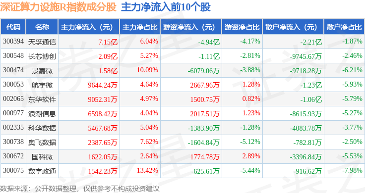 资金流向方面,深证算力设施R(470051)指数成份股当日主力资金净流出合计11.32亿元,游资资金净流出合计1.44亿元,散户资金净流入合计12.76亿元。成份股资金流向详情见下表: