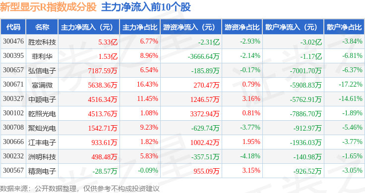 资金流向方面,新型显示R(470048)指数成份股当日主力资金净流出合计15.15亿元,游资资金净流出合计3272.85万元,散户资金净流入合计15.47亿元。成份股资金流向详情见下表: