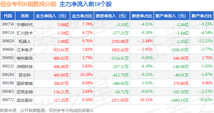 资金流向方面,创业专利R(470068)指数成份股当日主力资金净流出合计7.01亿元,游资资金净流出合计1.01亿元,散户资金净流入合计8.02亿元。成份股资金流向详情见下表: