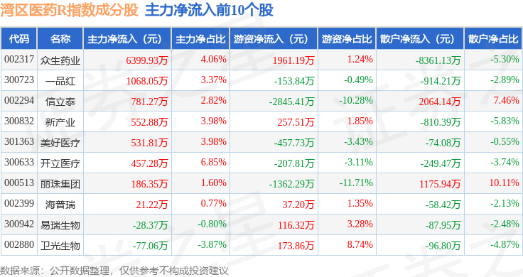 资金流向方面,湾区医药R(480013)指数成份股当日主力资金净流出合计1.5亿元,游资资金净流出合计1410.43万元,散户资金净流入合计1.64亿元。成份股资金流向详情见下表: