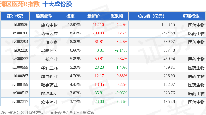 证券之星消息,12月4日,湾区医药R(480013)指数报收于2287.5点,涨0.37%,成交72.16亿元,换手率1.01%。当日该指数成份股中,上涨的有13家,康方生物以4.4%的涨幅领涨,下跌的有16家,特一药业以8.61%的跌幅领跌。