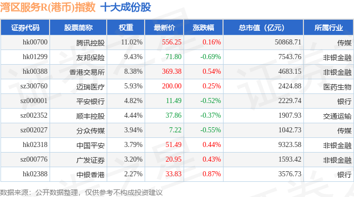 湾区服务R(港币)(480012)指数十大成份股详情如下: