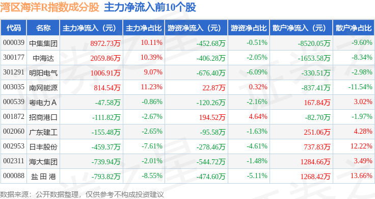 资金流向方面,湾区海洋R(480019)指数成份股当日主力资金净流出合计1.24亿元,游资资金净流入合计344.34万元,散户资金净流入合计1.21亿元。成份股资金流向详情见下表: