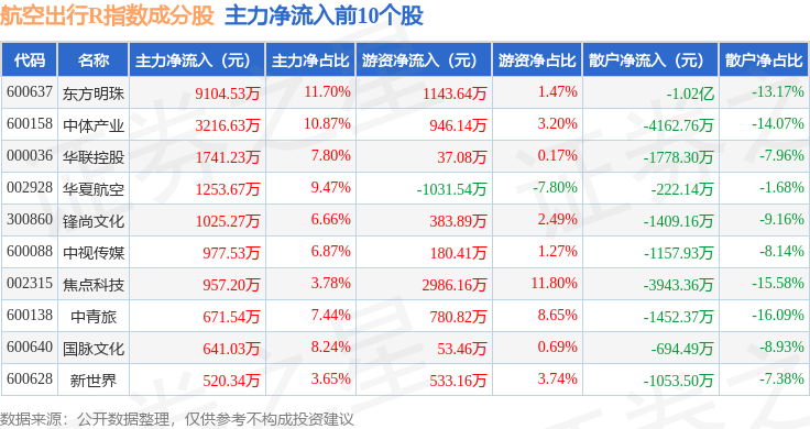 资金流向方面,航空出行R(480059)指数成份股当日主力资金净流出合计10.02亿元,游资资金净流入合计1.93亿元,散户资金净流入合计8.09亿元。成份股资金流向详情见下表: