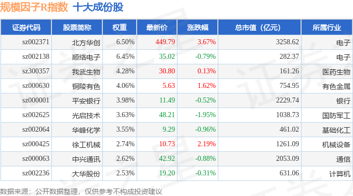 证券之星消息,12月4日,规模因子R(480055)指数报收于2288.82点,涨0.14%,成交360.27亿元,换手率1.11%。当日该指数成份股中,上涨的有23家,北方华创以3.67%的涨幅领涨,下跌的有27家,明月镜片以2.87%的跌幅领跌。