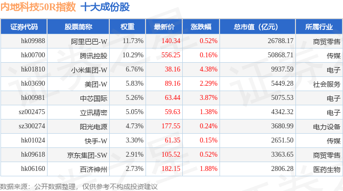 证券之星消息,12月4日,内地科技50R(483003)指数报收于3332.7点,涨1.0%,成交786.87亿元,换手率1.03%。当日该指数成份股中,上涨的有37家,药明生物以7.09%的涨幅领涨,下跌的有12家,晶澳科技以2.44%的跌幅领跌。