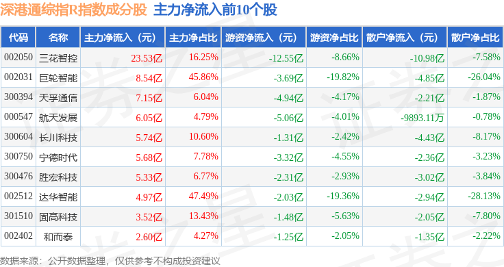 资金流向方面,深港通综指R(483005)指数成份股当日主力资金净流出合计147.23亿元,游资资金净流出合计28.87亿元,散户资金净流入合计176.1亿元。成份股资金流向详情见下表: