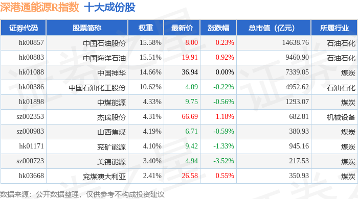 资金流向方面,深港通能源R(483013)指数成份股当日主力资金净流出合计1.27亿元,游资资金净流入合计5908.58万元,散户资金净流入合计6782.07万元。成份股资金流向详情见下表: