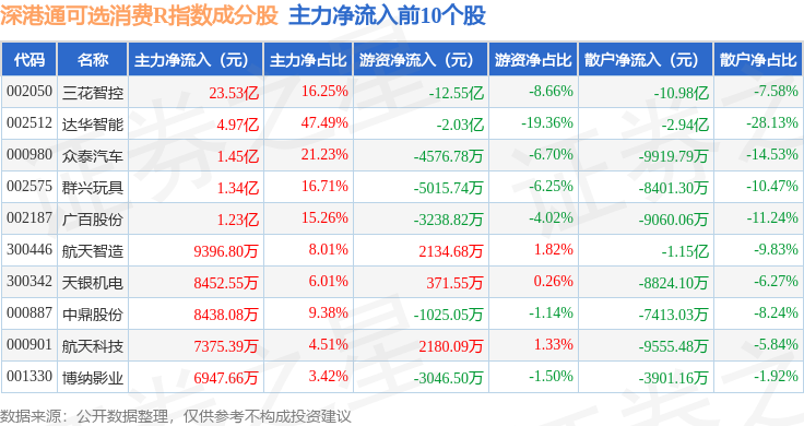 资金流向方面,深港通可选消费R(483019)指数成份股当日主力资金净流入合计8.26亿元,游资资金净流出合计14.83亿元,散户资金净流入合计6.57亿元。成份股资金流向详情见下表: