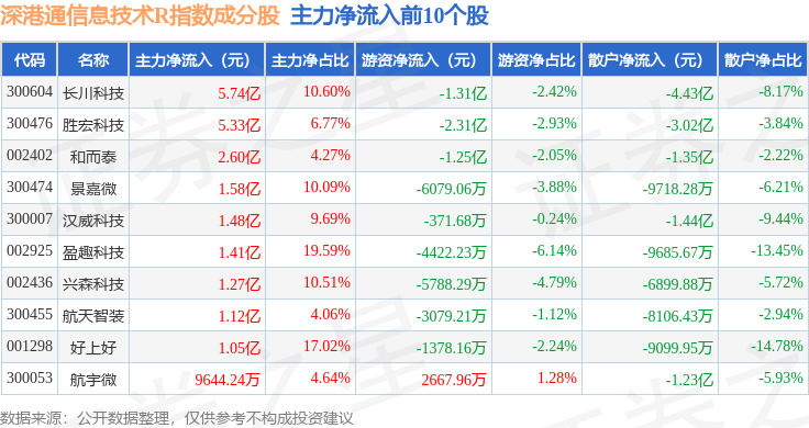 资金流向方面,深港通信息技术R(483027)指数成份股当日主力资金净流出合计43.65亿元,游资资金净流出合计6.65亿元,散户资金净流入合计50.29亿元。成份股资金流向详情见下表: