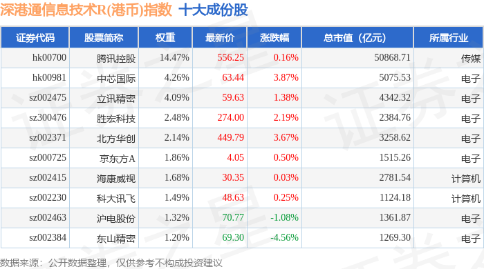 深港通信息技术R(港币)(483028)指数十大成份股详情如下: