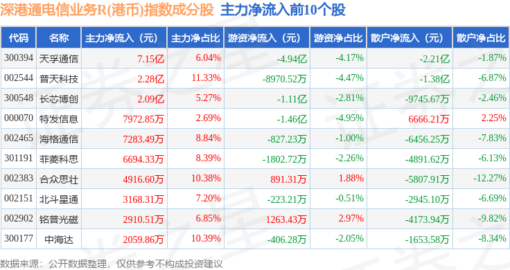 资金流向方面,深港通电信业务R(港币)(483030)指数成份股当日主力资金净流出合计11.31亿元,游资资金净流出合计3.31亿元,散户资金净流入合计14.61亿元。成份股资金流向详情见下表: