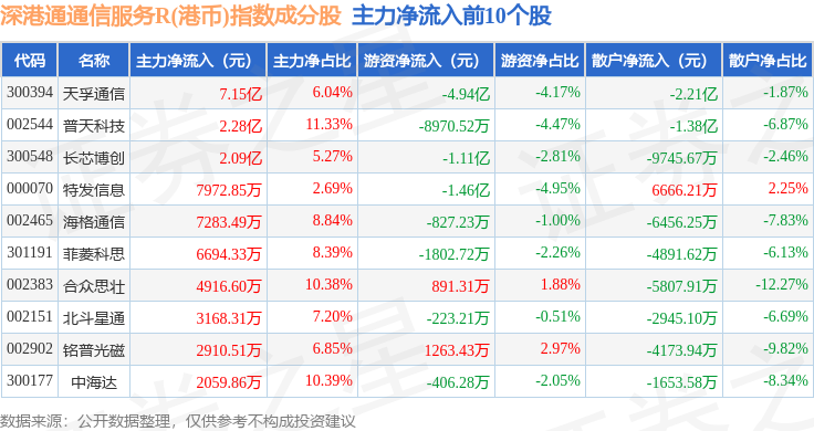 资金流向方面,深港通通信服务R(港币)(483034)指数成份股当日主力资金净流出合计10.04亿元,游资资金净流出合计3.56亿元,散户资金净流入合计13.6亿元。成份股资金流向详情见下表:
