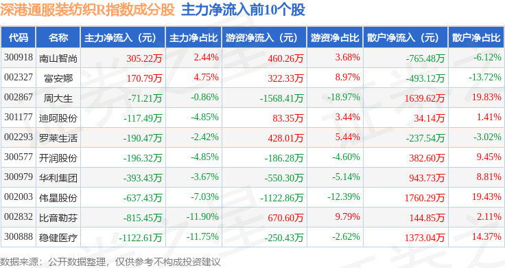 资金流向方面,深港通服装纺织R(483041)指数成份股当日主力资金净流出合计2.51亿元,游资资金净流出合计1491.34万元,散户资金净流入合计2.66亿元。成份股资金流向详情见下表: