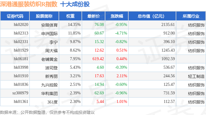 深港通服装纺织R(483041)指数十大成份股详情如下: