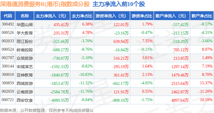 资金流向方面,深港通消费服务R(港币)(483046)指数成份股当日主力资金净流出合计4.69亿元,游资资金净流出合计2827.36万元,散户资金净流入合计4.98亿元。成份股资金流向详情见下表:
