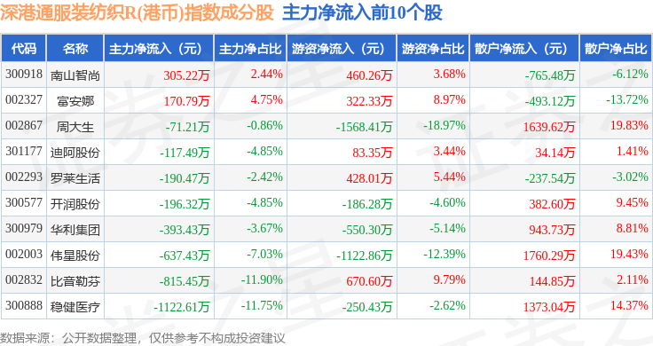 资金流向方面,深港通服装纺织R(港币)(483042)指数成份股当日主力资金净流出合计2.51亿元,游资资金净流出合计1491.34万元,散户资金净流入合计2.66亿元。成份股资金流向详情见下表: