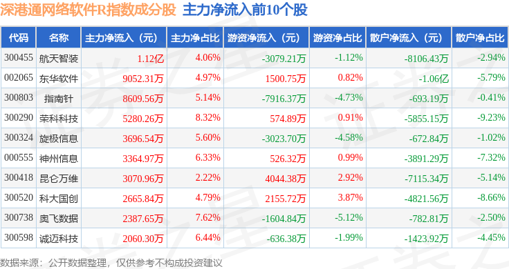资金流向方面,深港通网络软件R(483047)指数成份股当日主力资金净流出合计12.07亿元,游资资金净流出合计1.02亿元,散户资金净流入合计13.08亿元。成份股资金流向详情见下表: