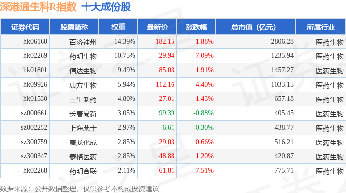 证券之星消息,12月4日,深港通生科R(483059)指数报收于7859.98点,涨1.87%,成交108.17亿元,换手率0.87%。当日该指数成份股中,上涨的有32家,药明合联以7.51%的涨幅领涨,下跌的有28家,华兰疫苗以5.75%的跌幅领跌。
