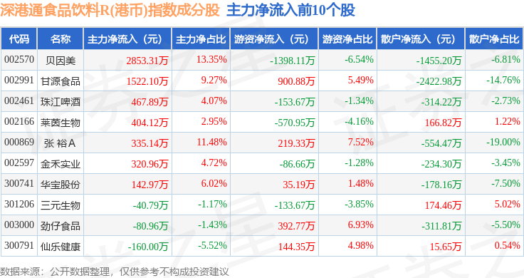资金流向方面,深港通食品饮料R(港币)(483066)指数成份股当日主力资金净流出合计14.78亿元,游资资金净流入合计2.55亿元,散户资金净流入合计12.23亿元。成份股资金流向详情见下表: