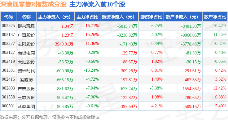 资金流向方面,深港通零售R(483073)指数成份股当日主力资金净流出合计2034.29万元,游资资金净流出合计1.47亿元,散户资金净流入合计1.67亿元。成份股资金流向详情见下表: